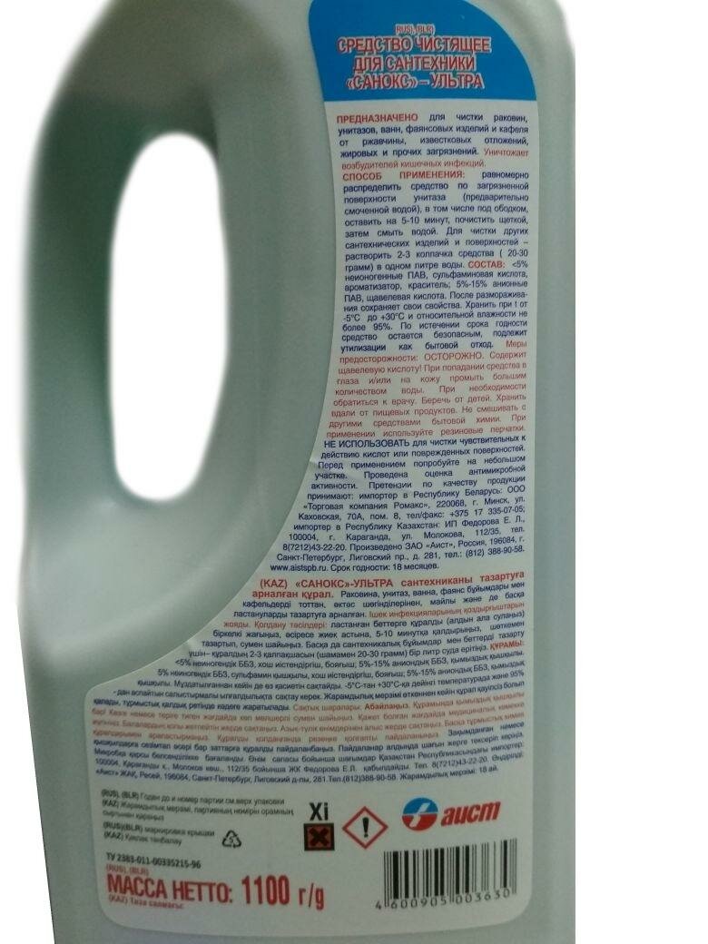 Средство для чистки сантехнических изделий санокс ультра 1100мл 4600905003630