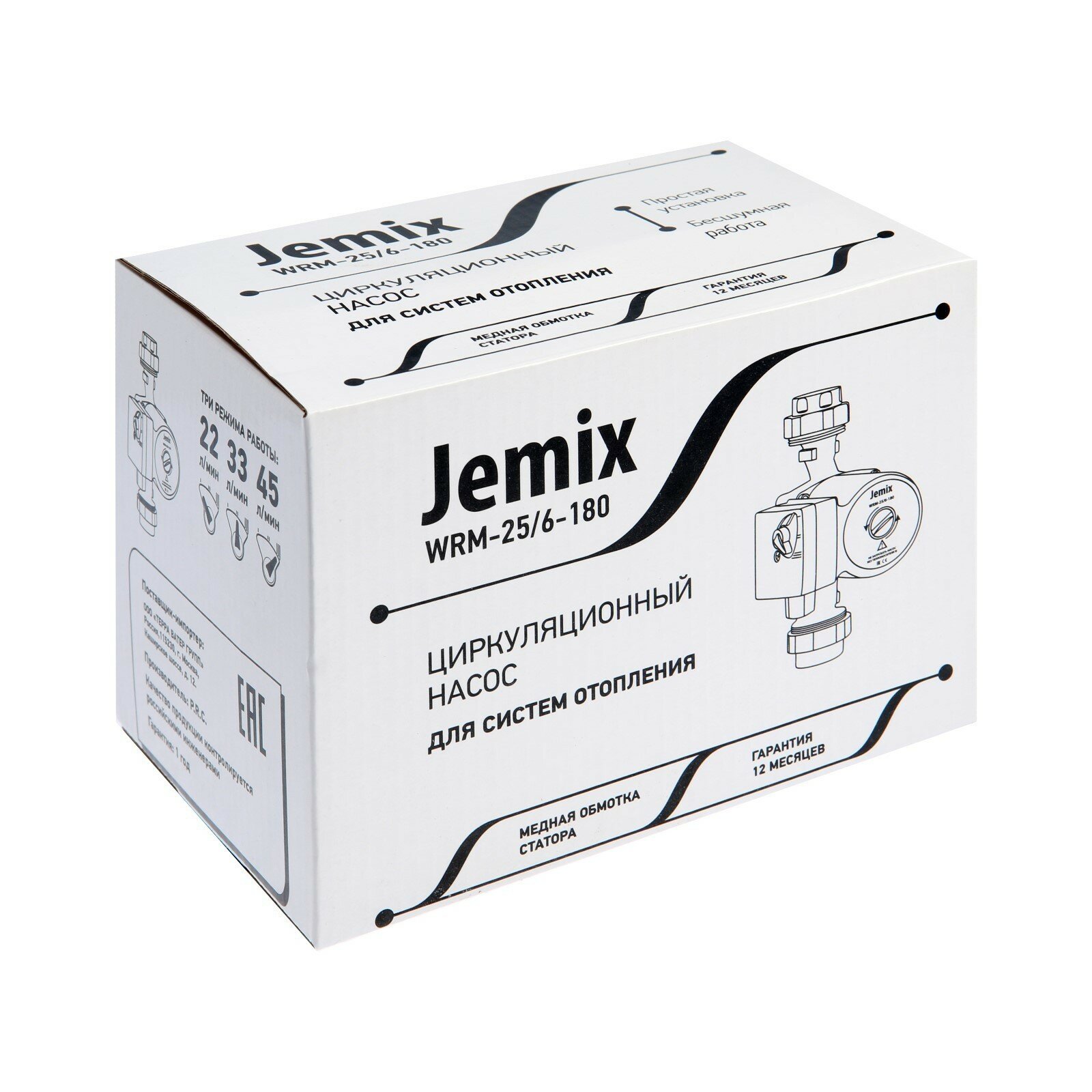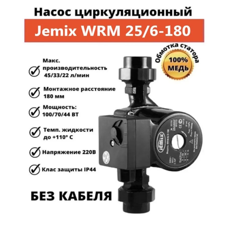 Насос циркуляционный JEMIX WRM-25/6-180, 100/70/44 Вт, напор 5 м, 45/33/22 л/мин, без кабеля