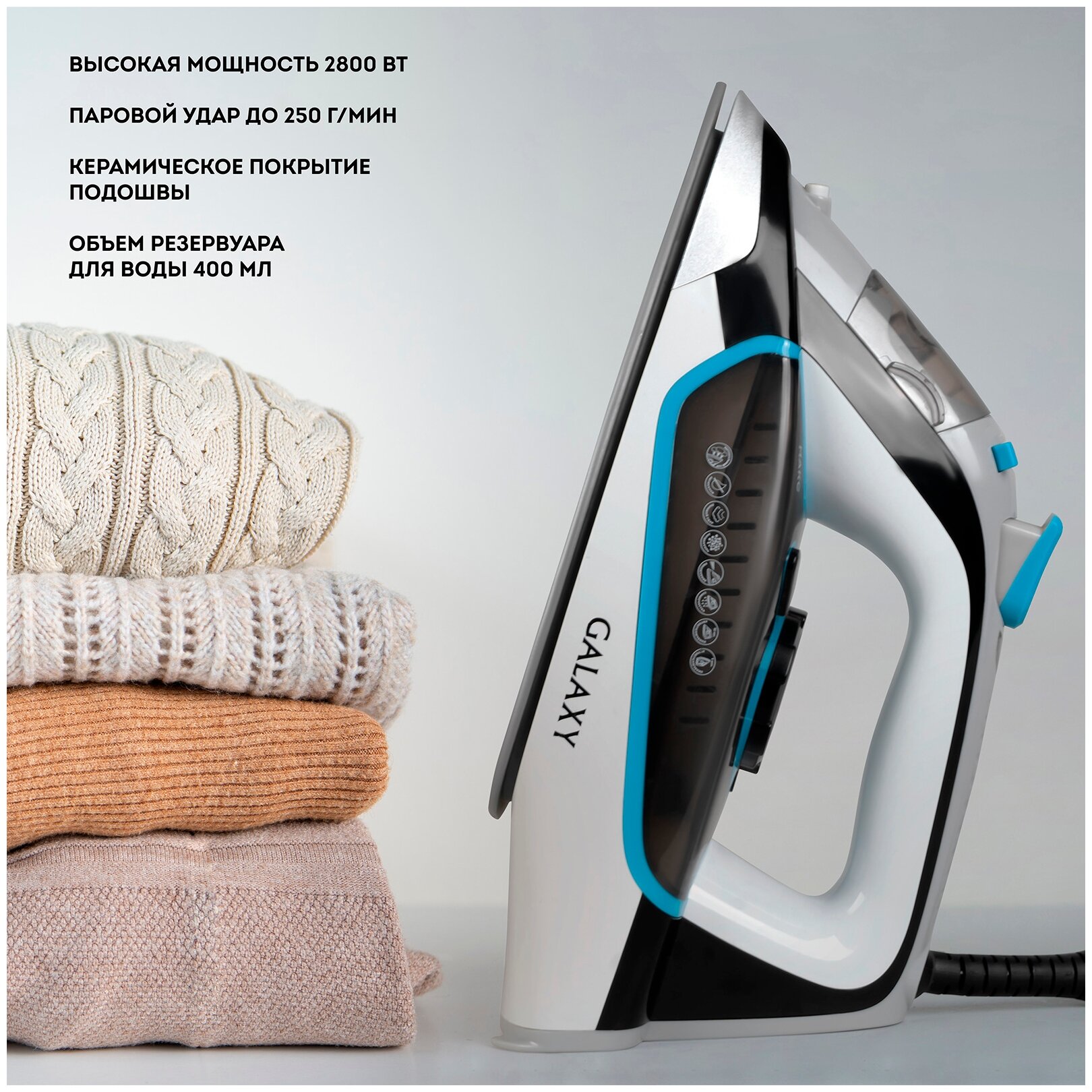 GALAXY GL 6107 Утюг 2800 Вт, керамическое покрытие подошвы, уплотнитель крышки резервуара, функции: «автоотключение», «самоочистка», «антикапля», «антинакипь», индикатор автоотключения, указатель максимального уровня воды, индикатор нагрева, вертикальное