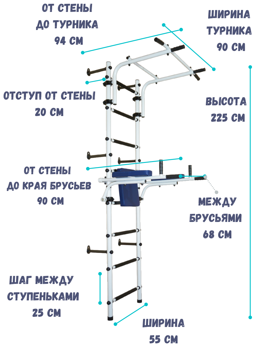 | Плюсы: | Цена-качество. Есть все, что необходимо для начинающих заниматься спортом. Подходит не только для детей, но и для взрослых-сделано крепко. Регулируемый по высоте турник, обрезиненные перекладины, красивый цвет. Надежное крепление к стене. Возможность дооборудовать дополнительными приспособлениями: груша, скамейка, кольца и т.д. |