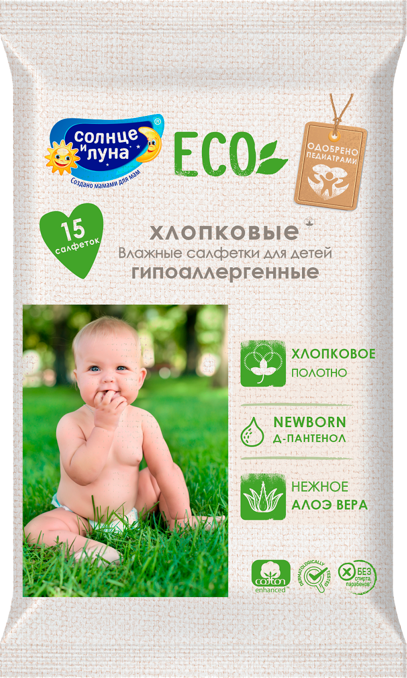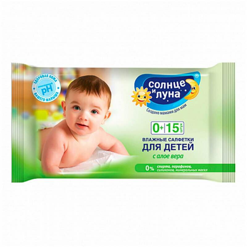Солнце и Луна Салфетки влажные для детей с алоэ вера (без спирта, парабенов, силиконов и минеральных масел), 15 шт