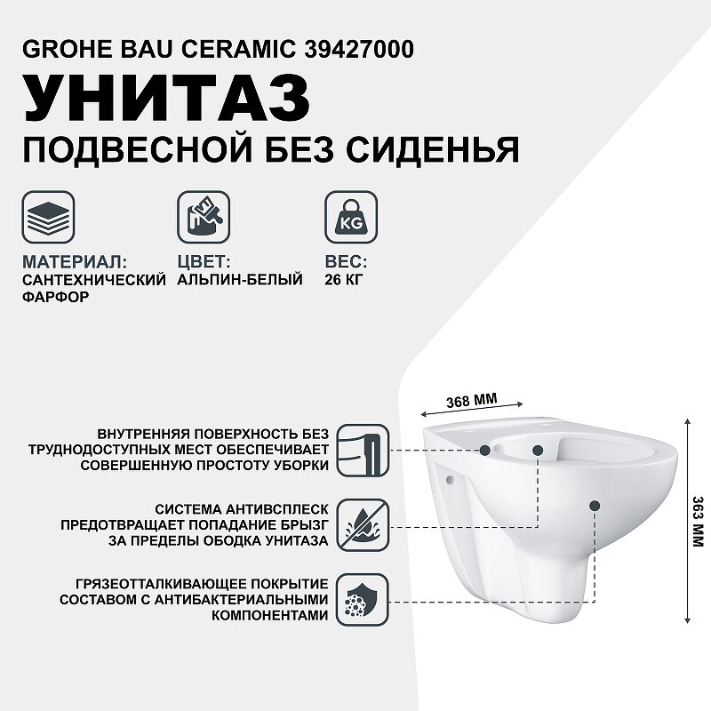 Подвесной унитаз Grohe Bau Ceramic 39427000 без сиденья