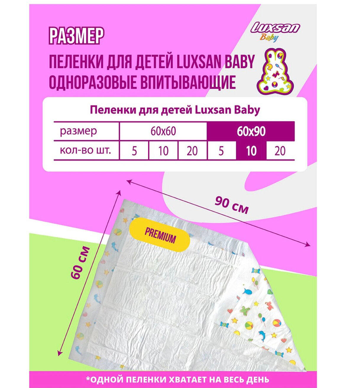 Пеленки одноразовые 60х90, (10 шт.) Luxsan Baby PREMIUM 60х90, 10 шт.