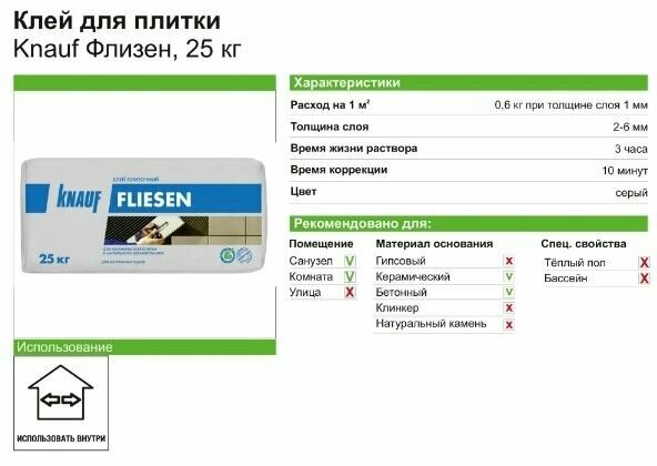 | Плюсы: | Пластичный, хорошо кладется на плитку, после приклеивания глухой звук при простукивании |