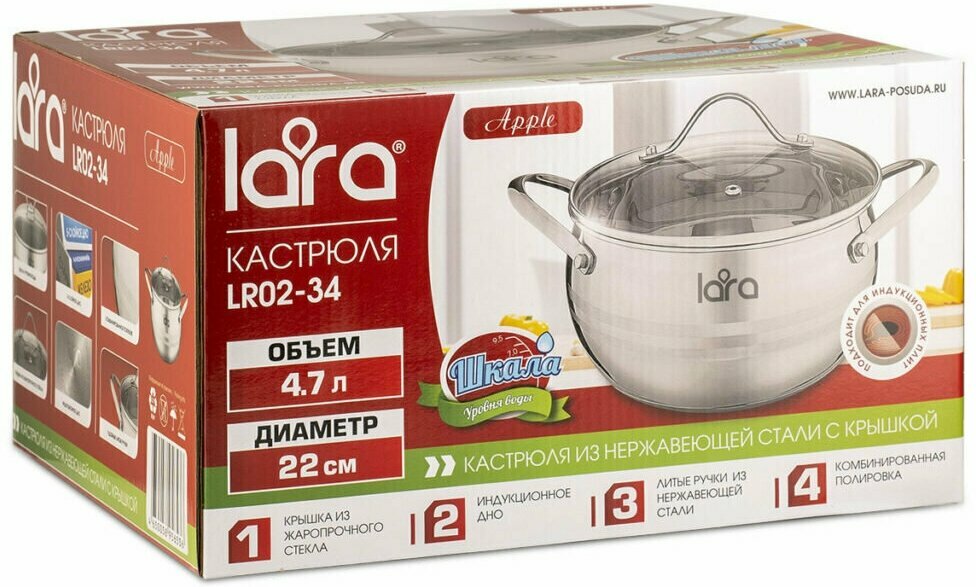 Кастрюля из нержавеющей стали 4,7л LARA LR02-34 - Apple d22 см, для всех типов плит, с крышкой