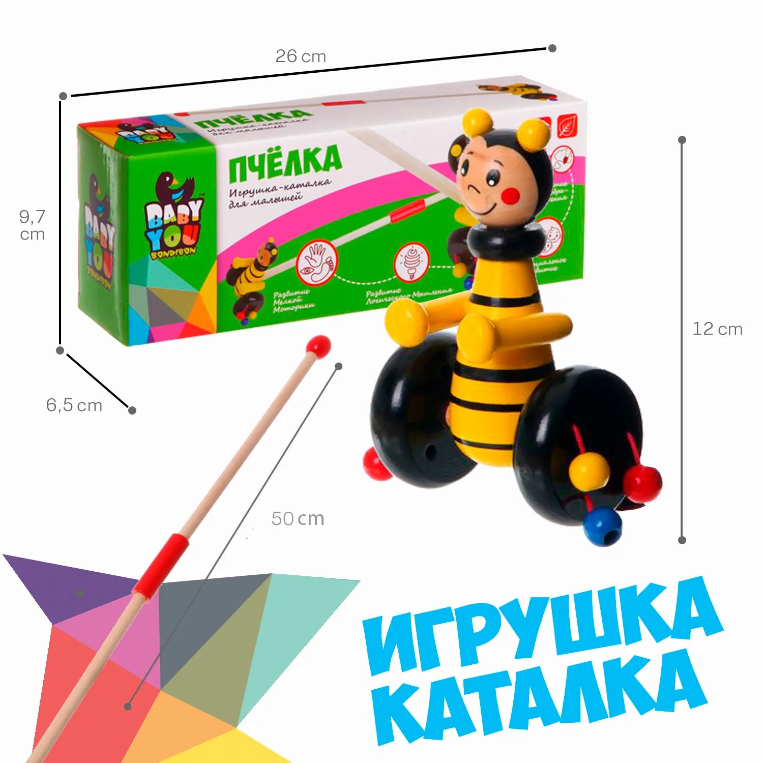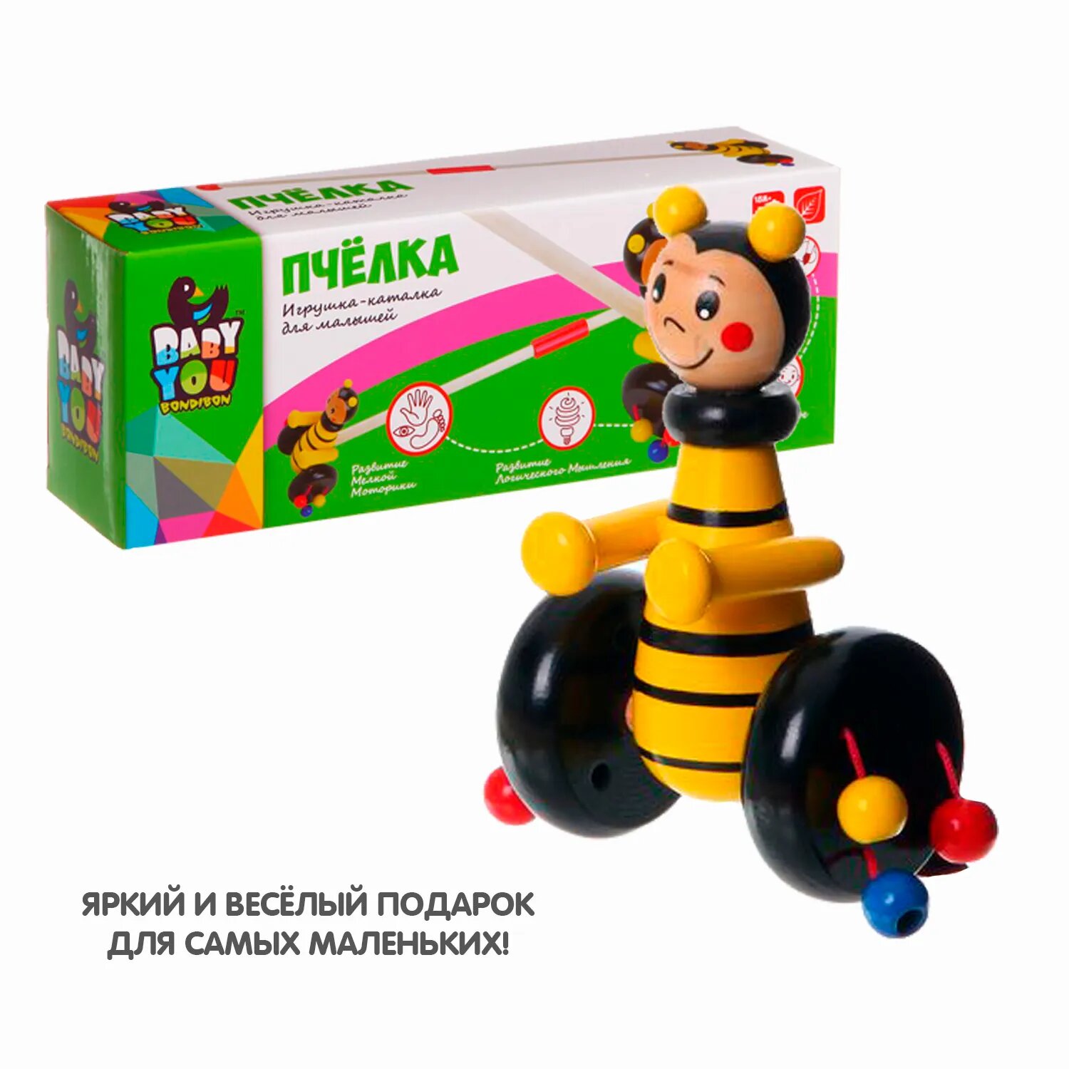 Игр. дерев., каталка с ручкой Пчелка, Bondibon, BOX 10х5х11,7 см.