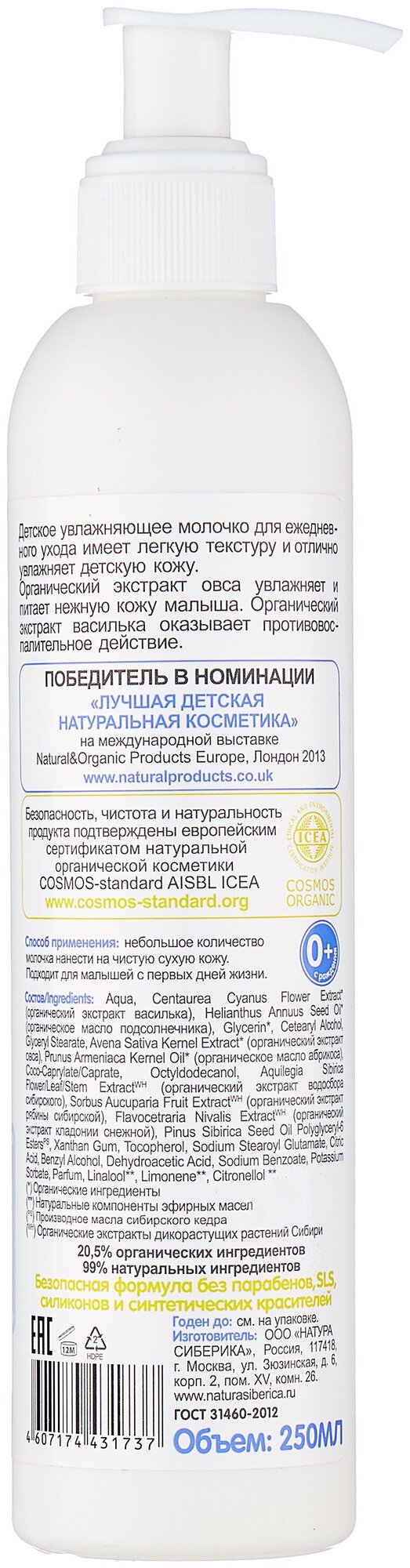 Детское увлажняющее молочко с экстрактами овса и василька Natura Siberica 250 г 250 мл