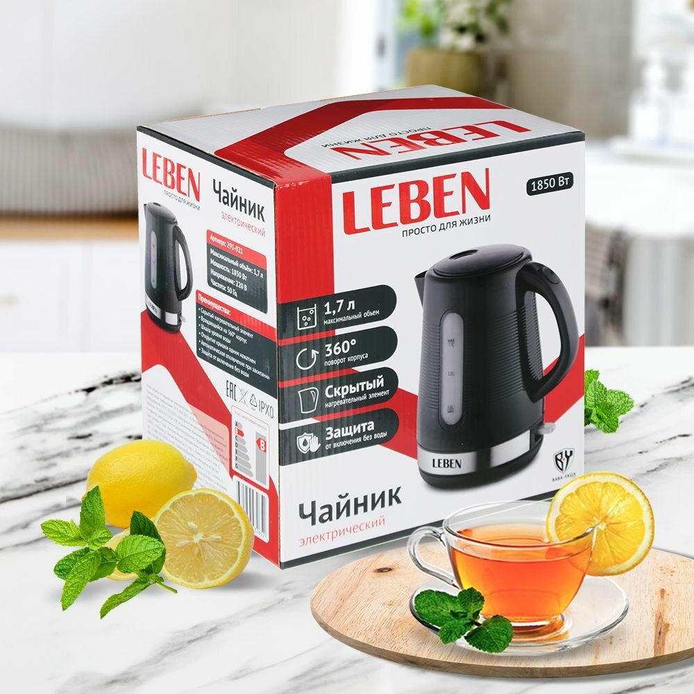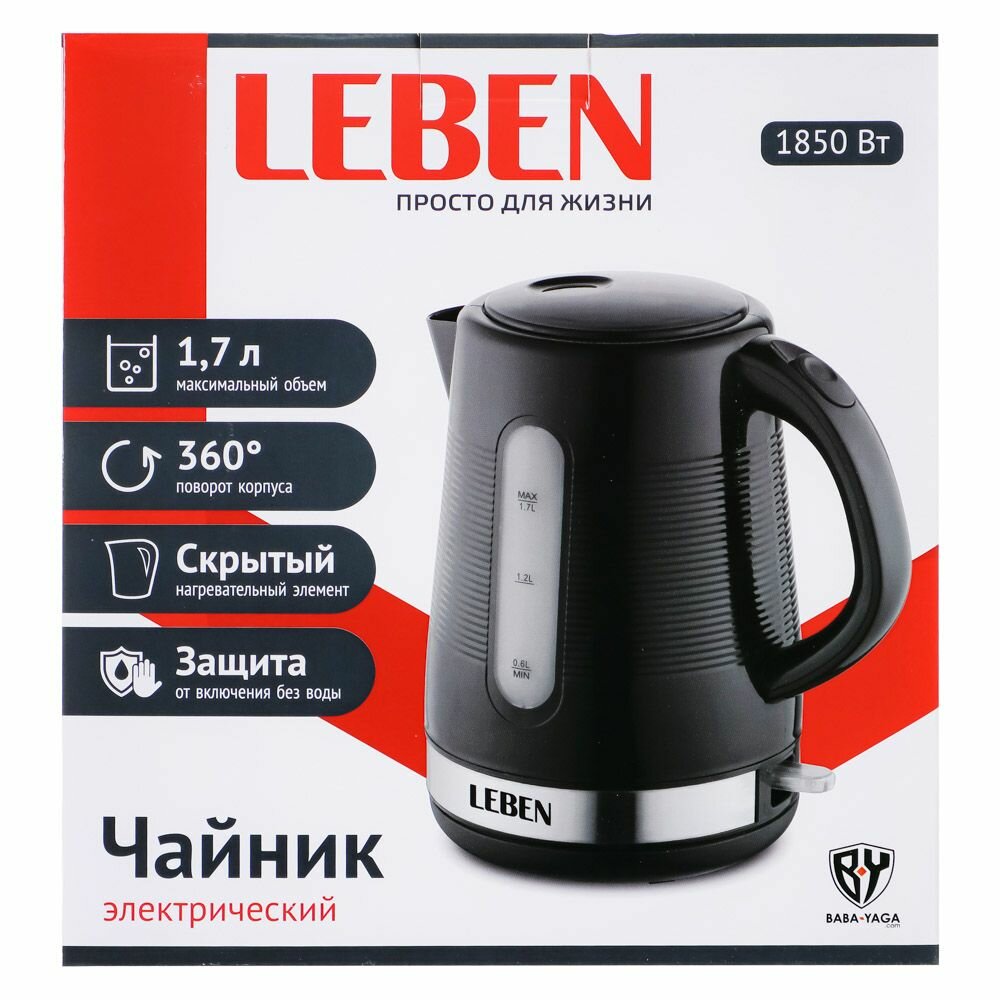 Ниже Вы можете прочитать отзывы на LEBEN Чайник электрический 1,7л, 1850Вт, скрытый нагр. элемент, рифлёный черный пластик., ознакомится с подробными характеристиками, посмотреть интересные обзоры и фотографии на LEBEN Чайник электрический 1,7л, 1850Вт, скрытый нагр. элемент, рифлёный черный пластик..