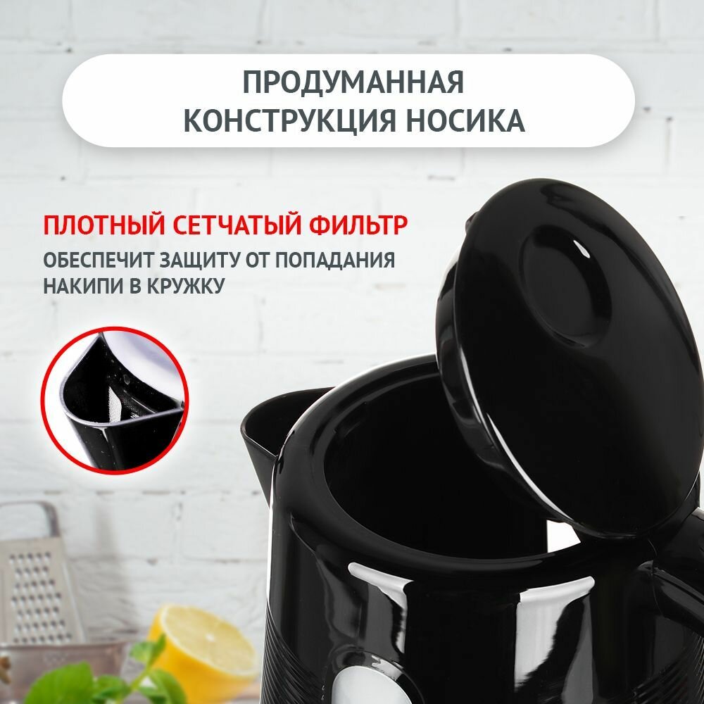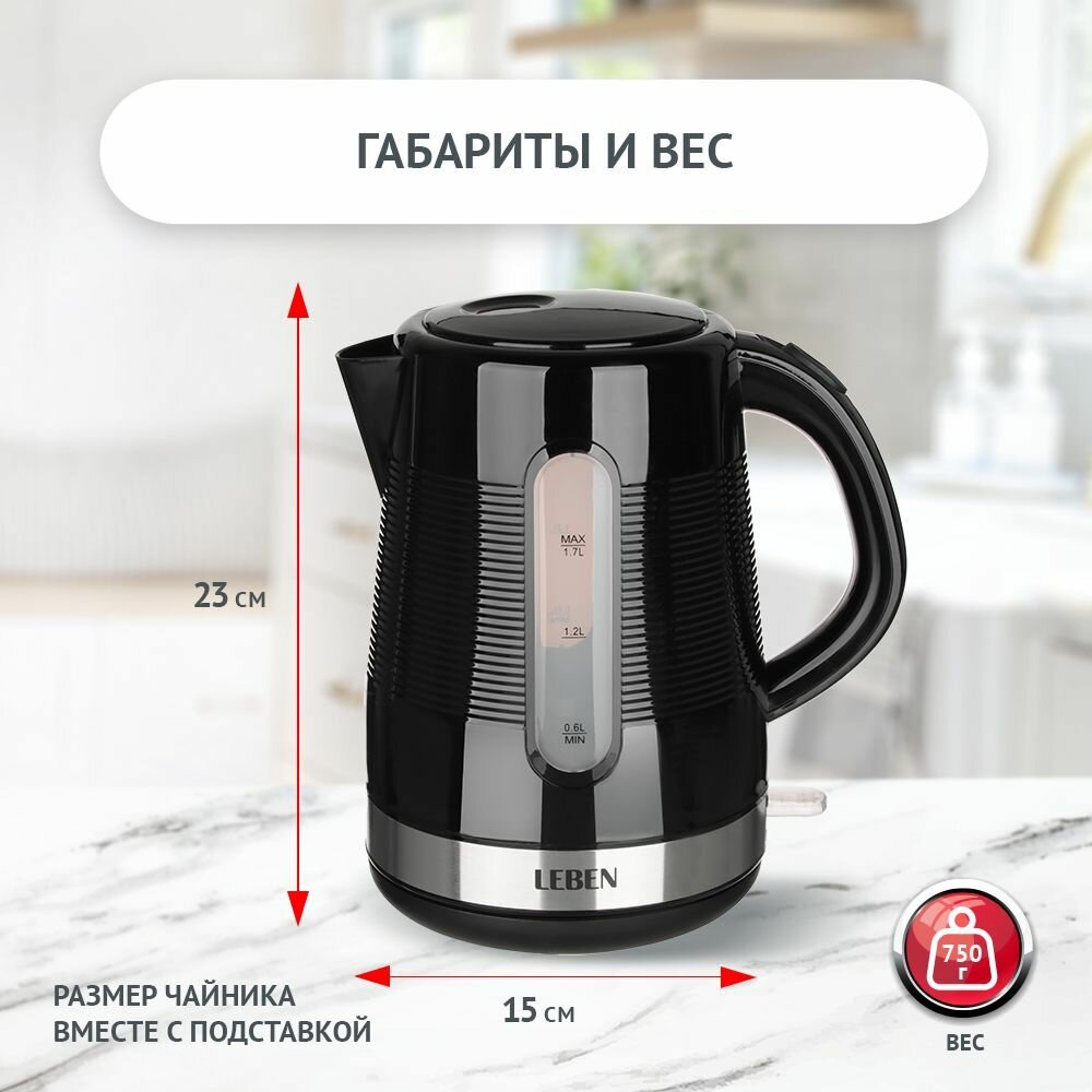 LEBEN Чайник электрический 1,7л, 1850Вт, скрытый нагр. элемент, рифлёный черный пластик. интересное: