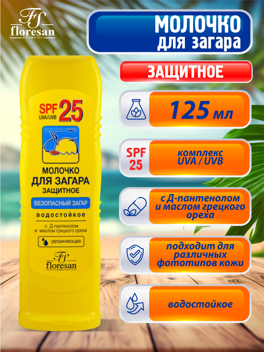 Молочко для загара солнцезащитное, водостойкое, SPF 25, 125 мл, "Floresan"