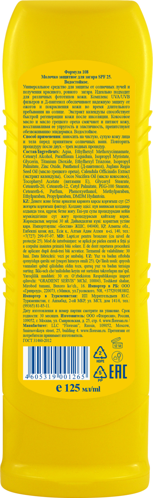Молочко защитное для загара Floresan Формула 108 водостойкое SPF25 125 мл.
