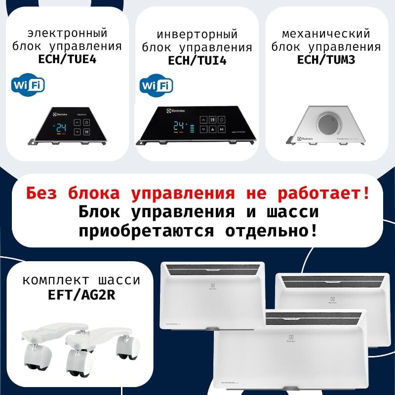 Выбрал инверторный блок управления, как наиболее экономичный. Шасси с колесами купил дополнительно, установились легко. Конвектор мощный, нагревается комната быстро. Поток воздуха распространяется по комнате равномерно, тепло комфортное.