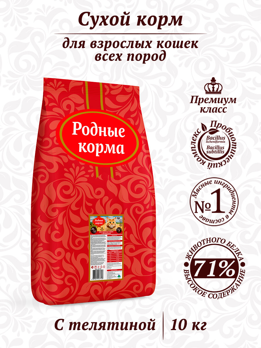Cухой корм для взрослых кошек с телятиной, родные корма 26/12, 3/5 пуда, 10 кг
