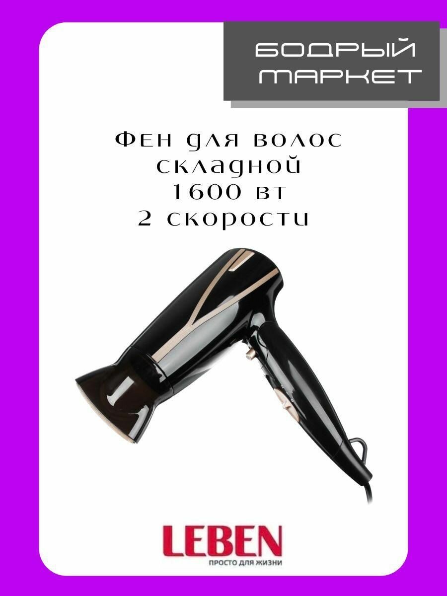 LEBEN Фен для волос складной, 1600Вт, 2 скорости интересное: