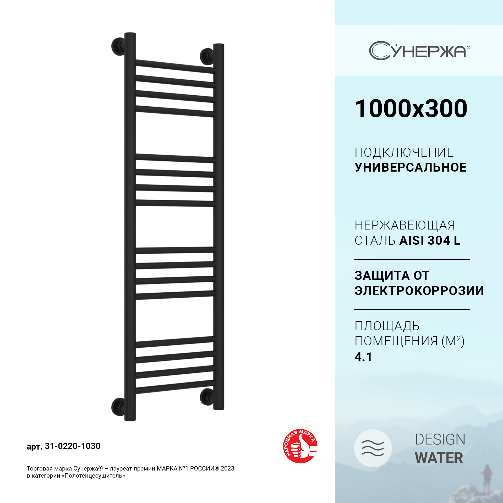 Водяной полотенцесушитель Сунержа Богема+ (прямая) 1000x300 матовый черный арт. 31-0220-1030