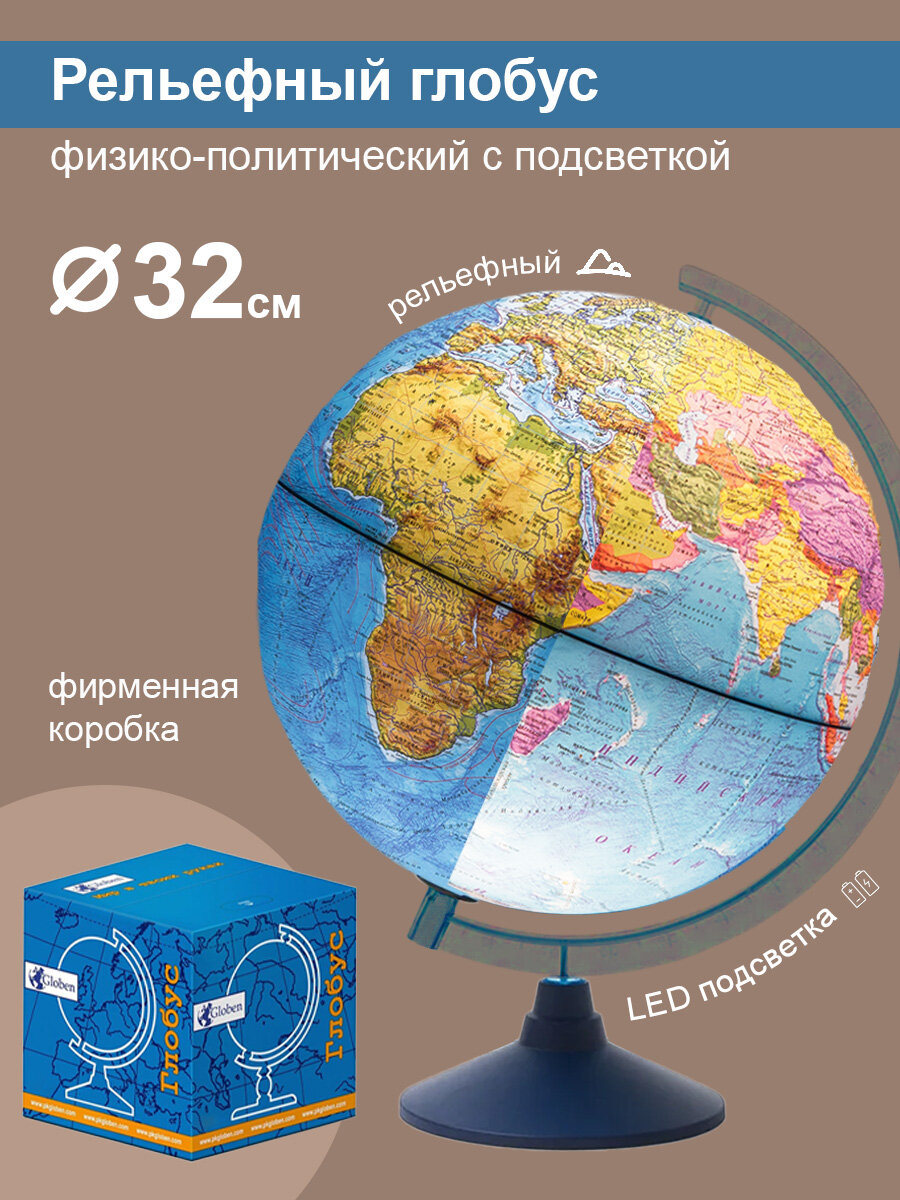 Глобус Земли Globen физико-политический, рельефный с подсветкой от батареек, 32 см. интересное: