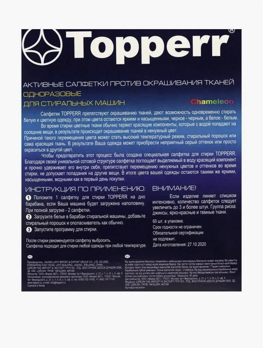 Topperr Салфетка для улавливания цвета при стирке, 60 шт. в коробке