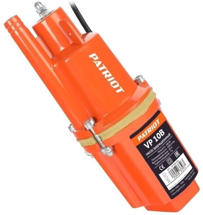 Насос погружной вибрационный PATRIOT VP 10В / верхний забор / 250 вт / 18 л/мин / H-60 м, D-96 мм / термозащита / для чистой воды