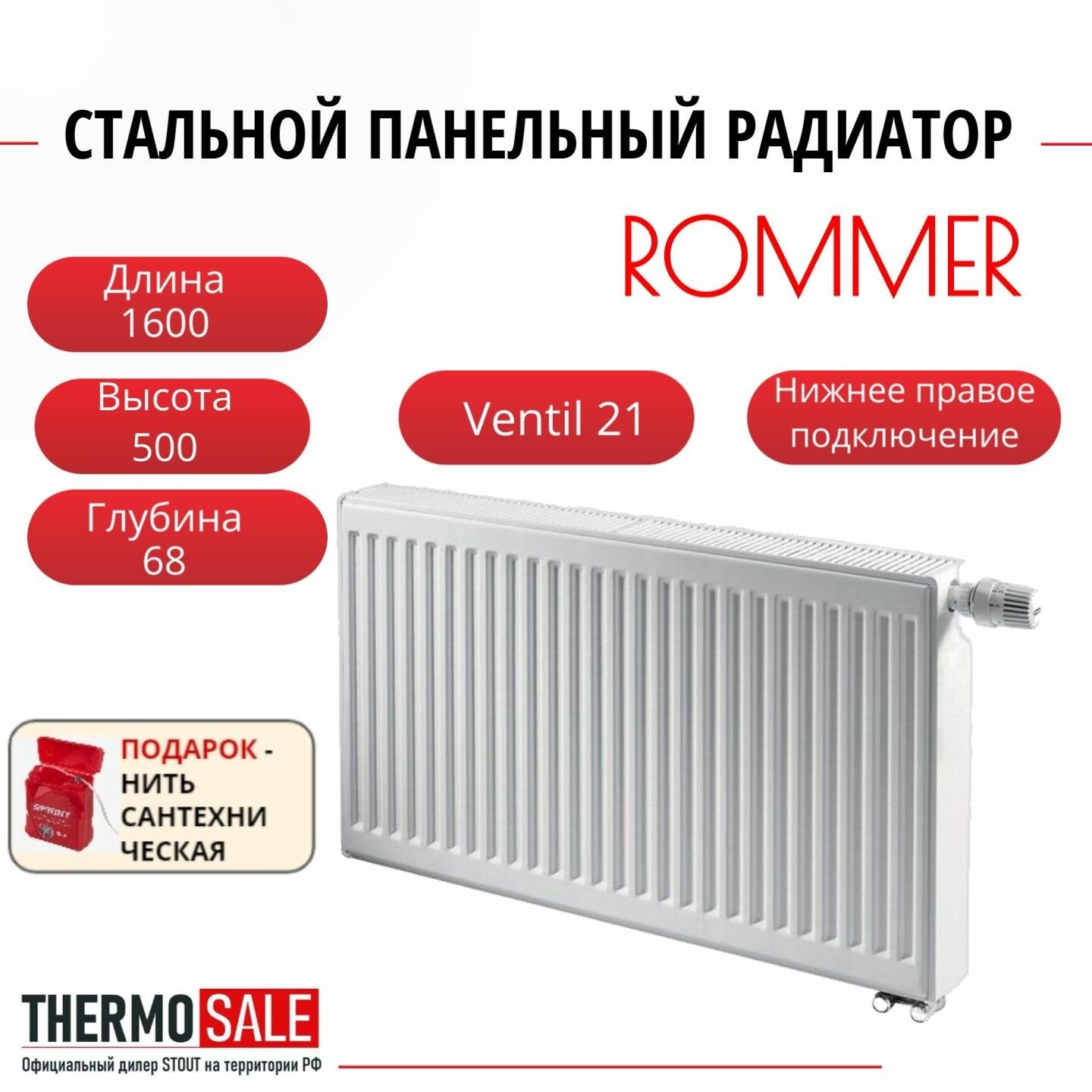 Радиатор стальной панельный ROMMER 500х600 нижнее правое подключение Ventil 21/500/600 Нить сантехническая