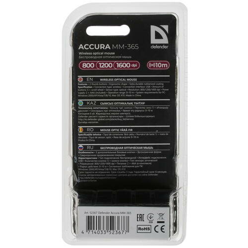 Defender беспроводная оптическая мышь Defender Accura MM-365 черный,6 кнопок, 800-1600 dpi 52365 .
