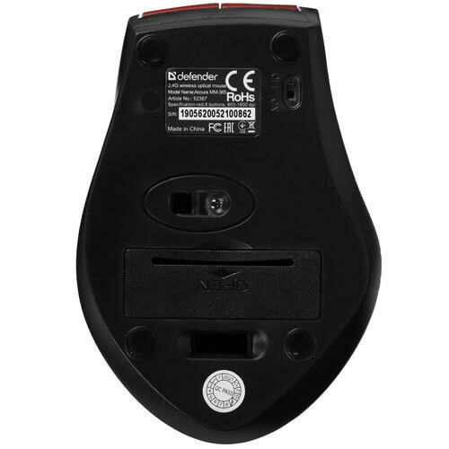 Мышь DEFENDER Accura MM-365, черная, беспроводная, 6 кнопок, 800-1600 dpi, USB. Количество кнопок: 5 + колесо-кнопка. Тип сенсора: оптический. Питание: 2 × AAA (в комплекте). Радиус действия: 10 м.