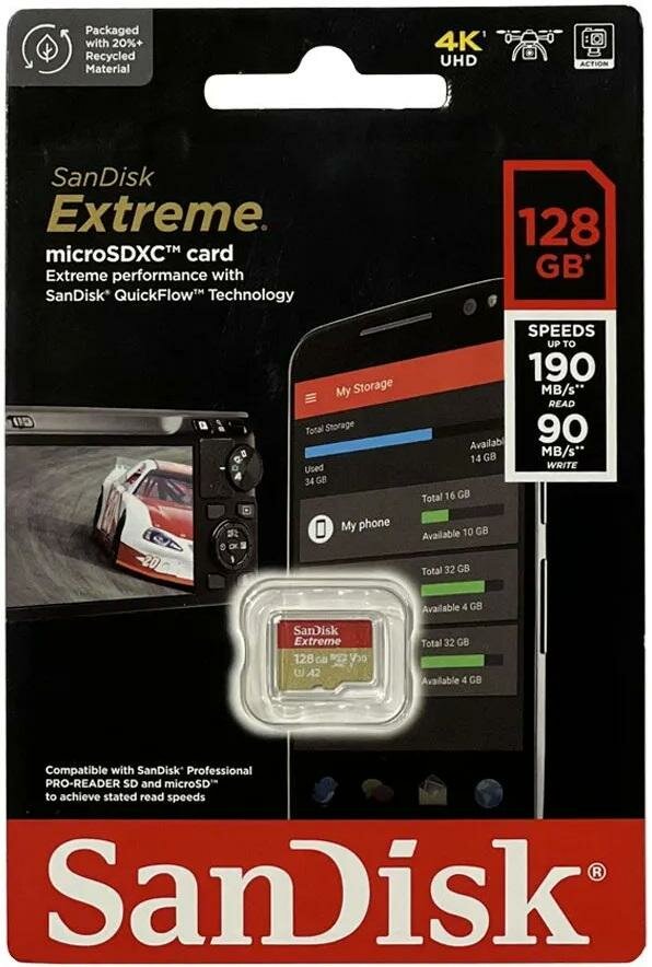 СохранитьMicro SD 128Gb SanDisk Extreme UHS I Card 128GB for 4K Video on Smartphones, Action Cams & Drones 190MB/s Read, 90MB/s SDSQXAA-128G-GN6MN интересное: