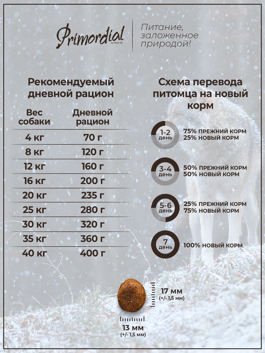 | Отзыв: | Сидим на смешанном кормлении, но сухой корм всё равно в приоритете. После нехорошего случая с одним из известных холистиков решил сменить корм на что-то другое и Примордиал привлёк составом и ценой, невысокой для такого состава. По прошествии времени можно уверенно сказать, что с выбором не ошибся, корм оказался качественный. И хорошо, что обжорства с ним нет, насыщение почти всегда от стандартной порции, это один из признаков натуральности и хорошего состава без усилителей |