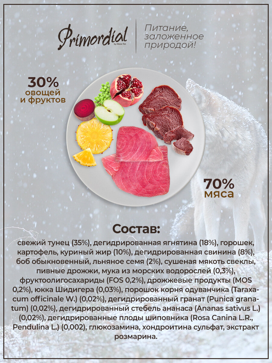 Корм Primordial Grain Free Adult All Breed Lamb & Tuna (беззерновой) для собак, с тунцом и ягненком, 400 г