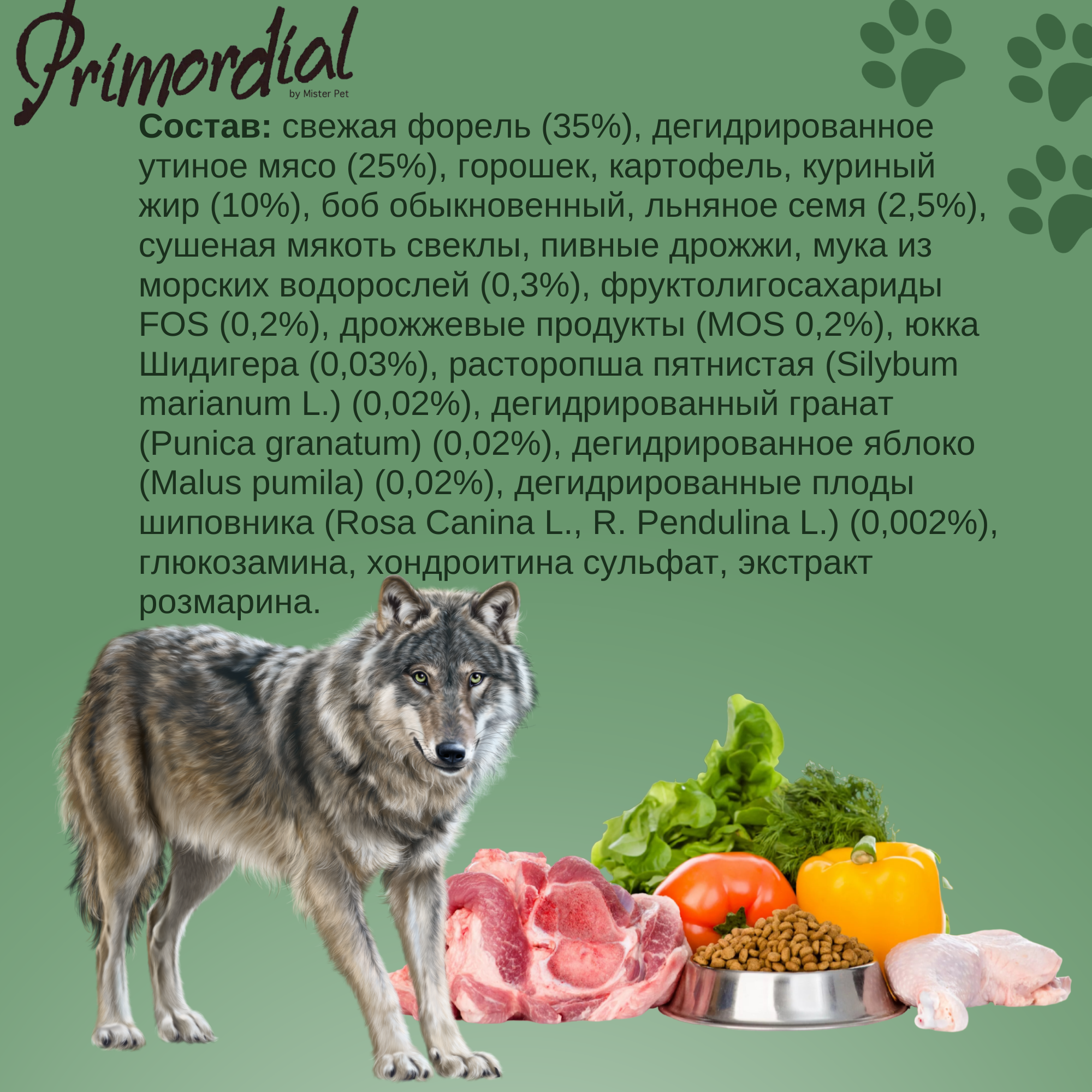 | Отзыв: | Полноценный холистик по приемлемой цене - Это про Primordial беззерновой. Лучше сразу через сайт заказывать, выходит дешевле. Форель-утка питательный корм, Джин им наедается. В составе мясо жирной рыбы и птицы. Энергии у пса на этом корме хоть отбавляй. |