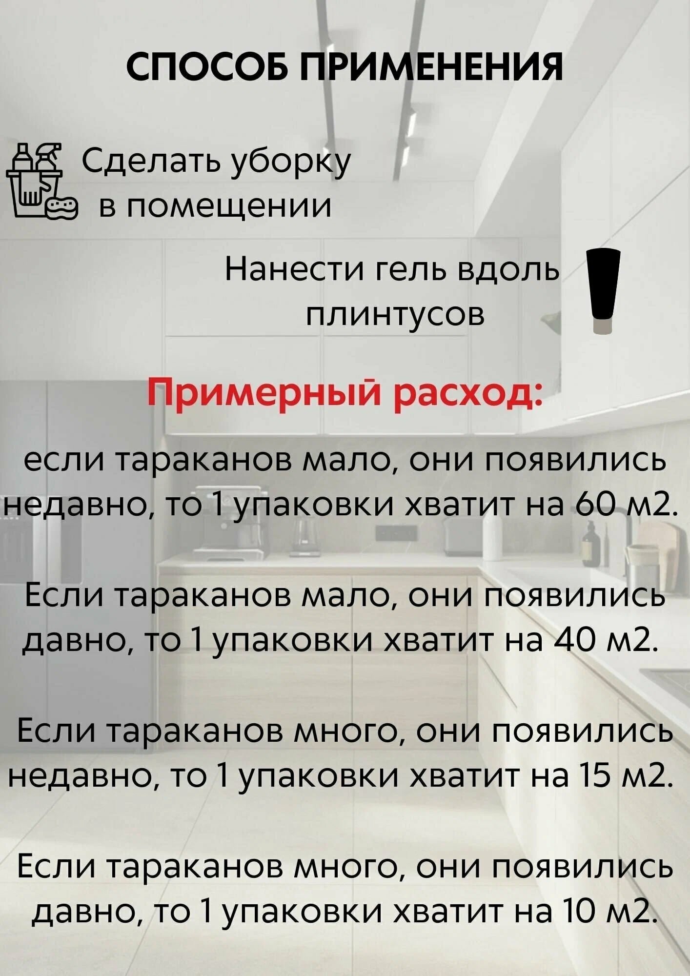 Пользуясь гелем, необходимо следить, чтоб в открытом доступе не оставались остатки пищи и даже капельки воды, грязная посуда. Насухо вытирайте на ночь раковины и ванну. |