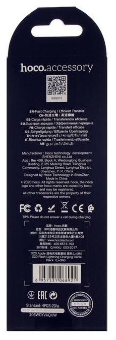 Кабель Hoco X20 Flash USB - Lightning, 3 м, черный