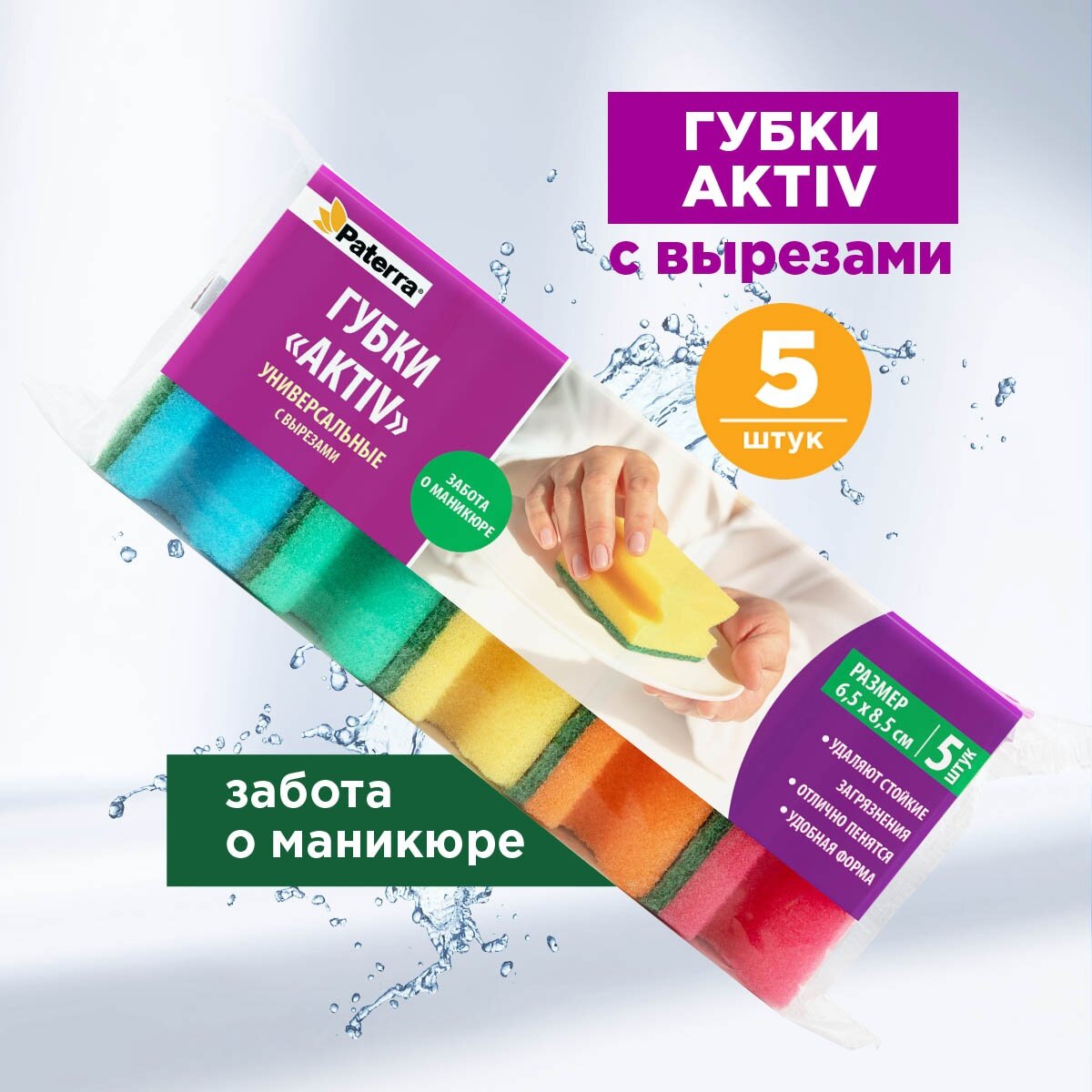 Губки кухонные AKTIV с вырезами 65*85*40мм "Paterra" 5 шт