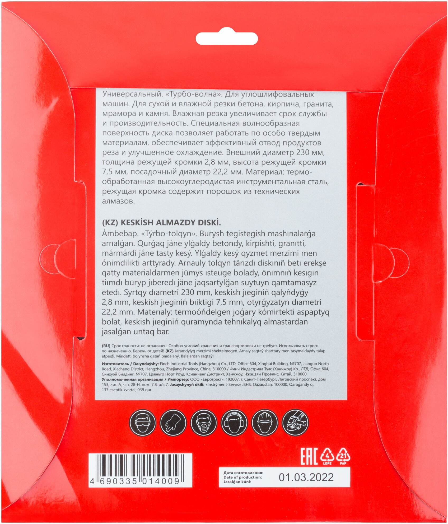 Диск отрезной алмазный "Турбо-волна" (сухая и влажная резка) 22.2 мм 230 мм курс 37275