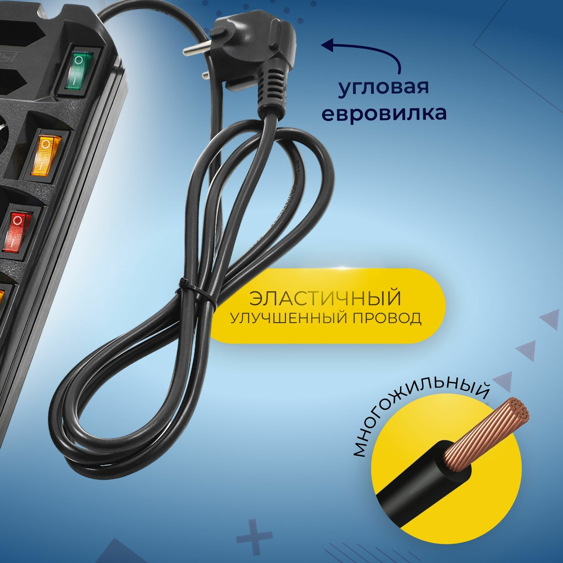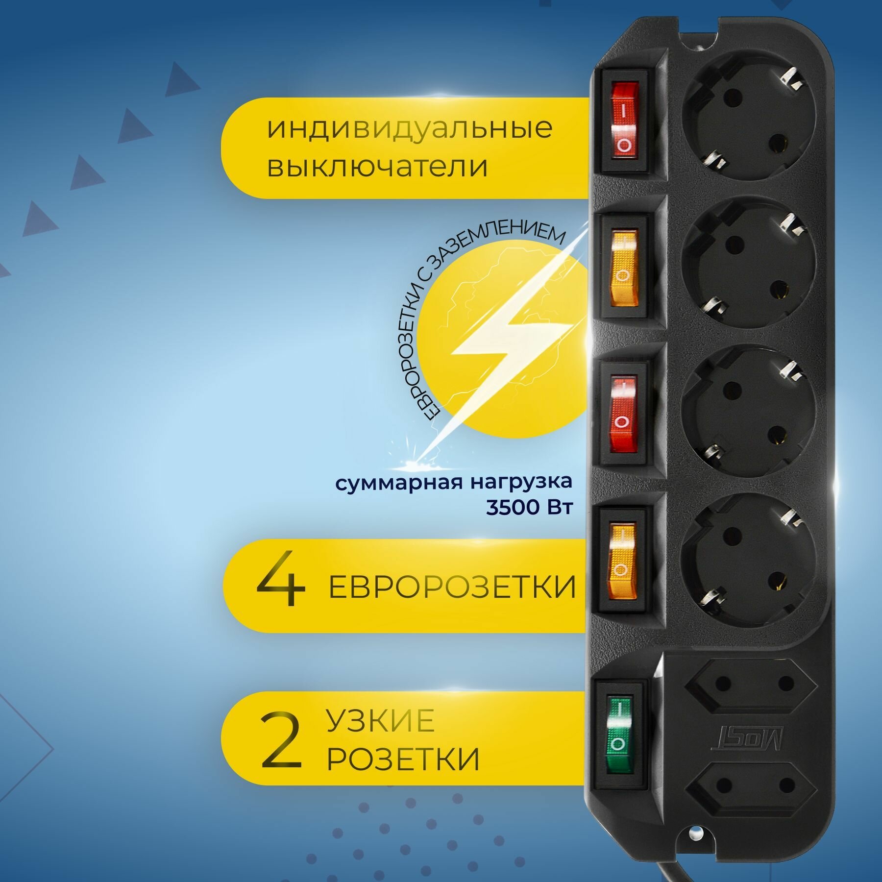 Удлинитель с индивидуальными выключателями MOST Active A16, 6 розеток, 16А 3500 Вт черный 3м