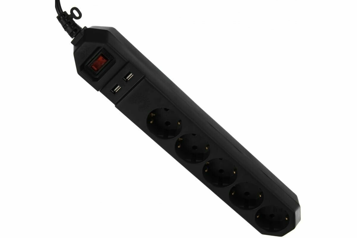 Сетевой фильтр 5гн с З/К 1,5м с выкл черный 2хUSB 10А IP20 ПВС 3х0,75мм2 ЭРА