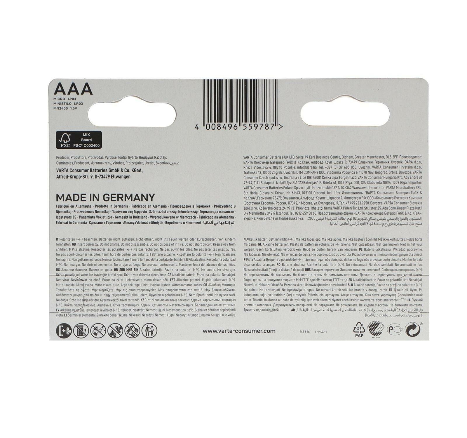 Варта / Varta - Батарейки Longlife Power Alkaline High Energy micro AAA LR03 1,5V 2 шт
