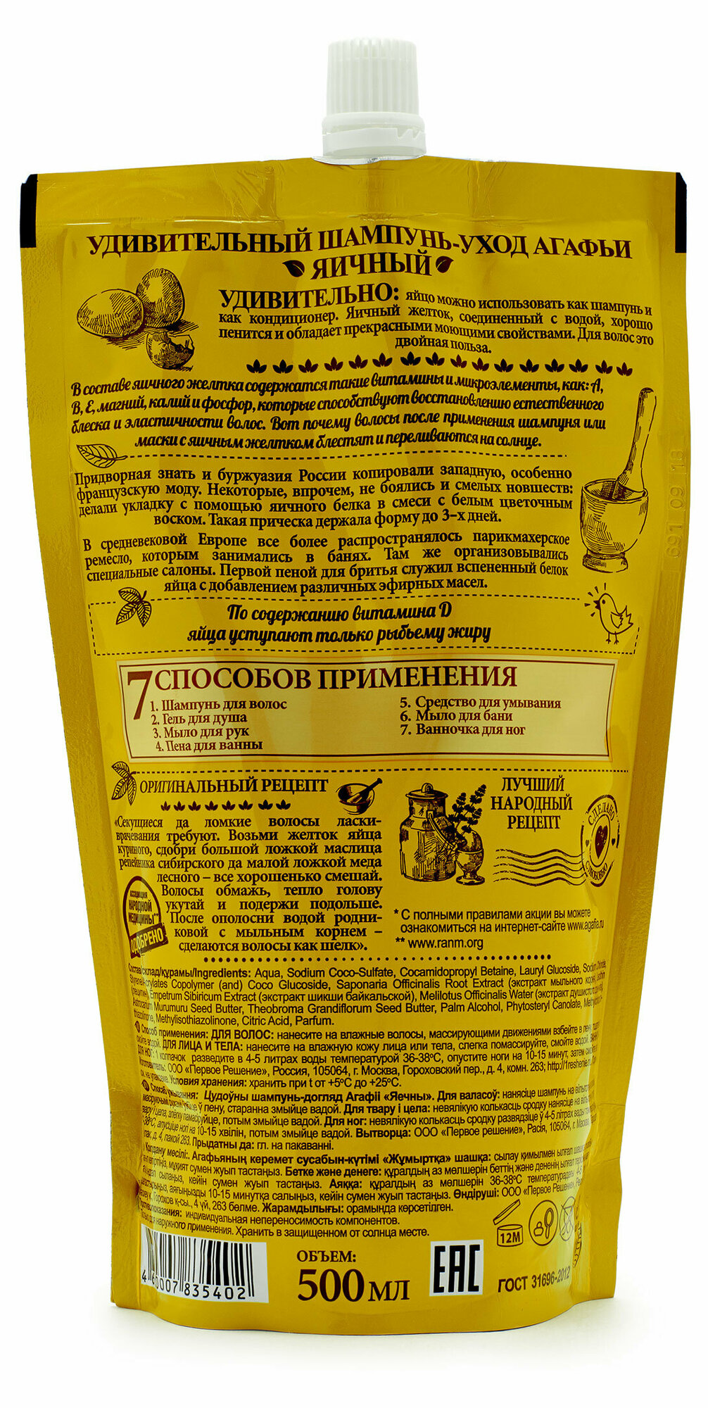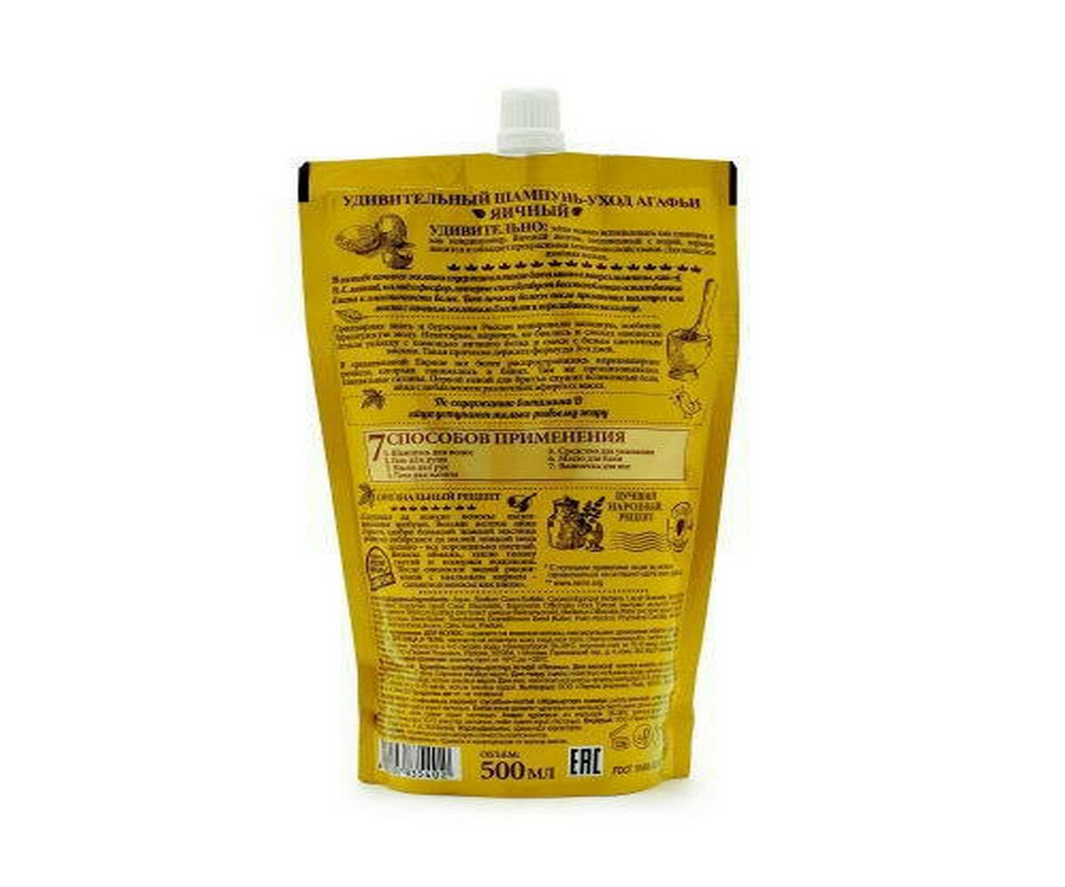 Шампунь для волос Удивительная Серия Агафьи Яичный, 7 свойств, дой пак, 500 мл Рецепты бабушки Ага .