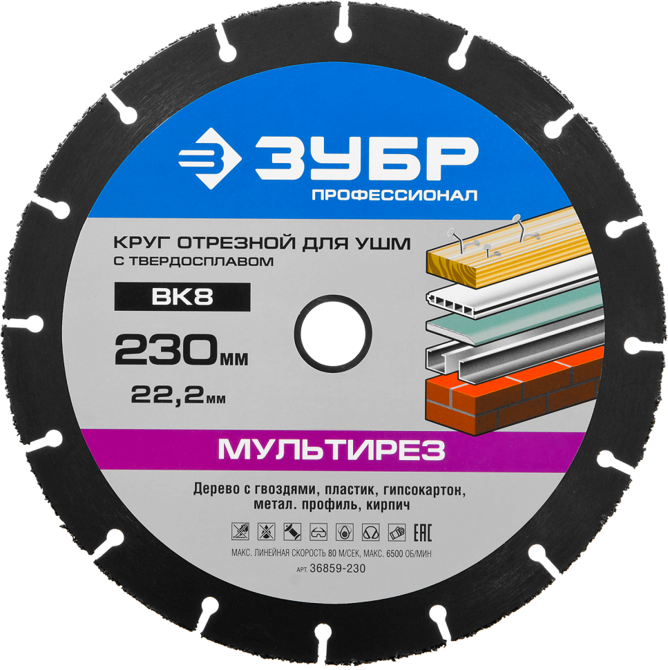 Отрезной круг МУЛЬТИРЕЗ-ВК8 для УШМ 230х22,2 ЗУБР 36859-230