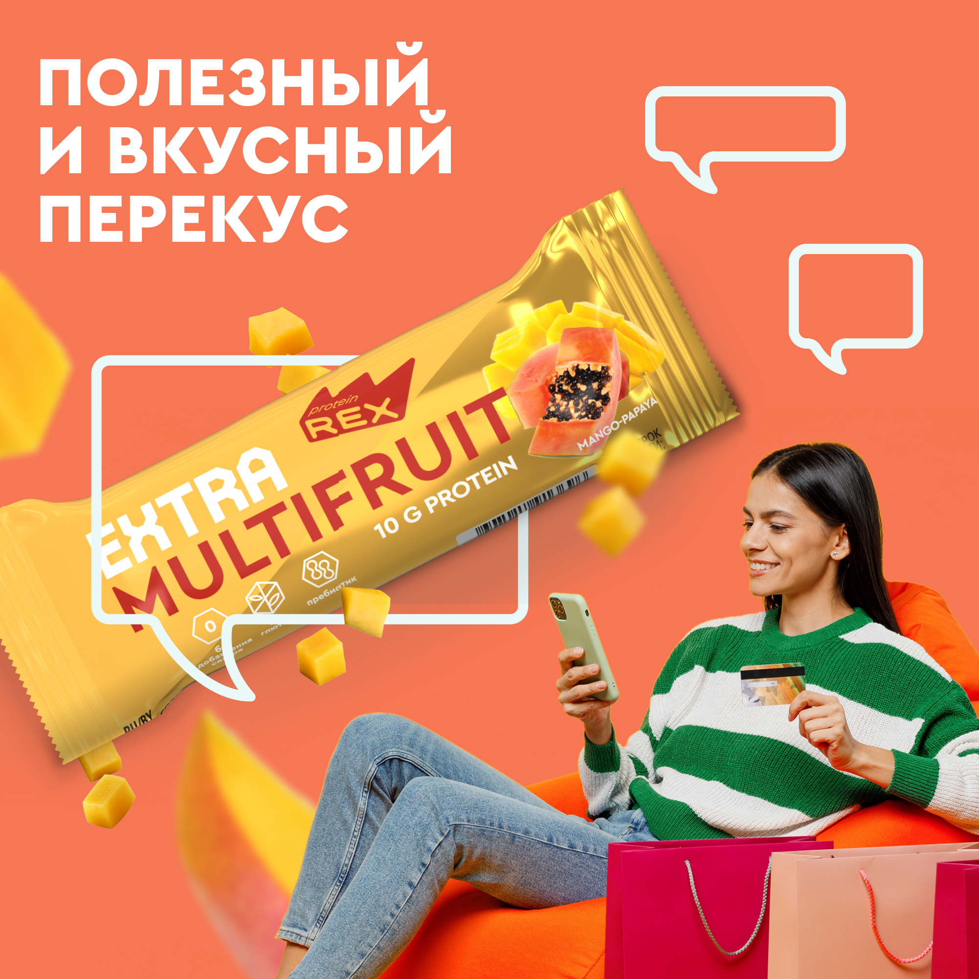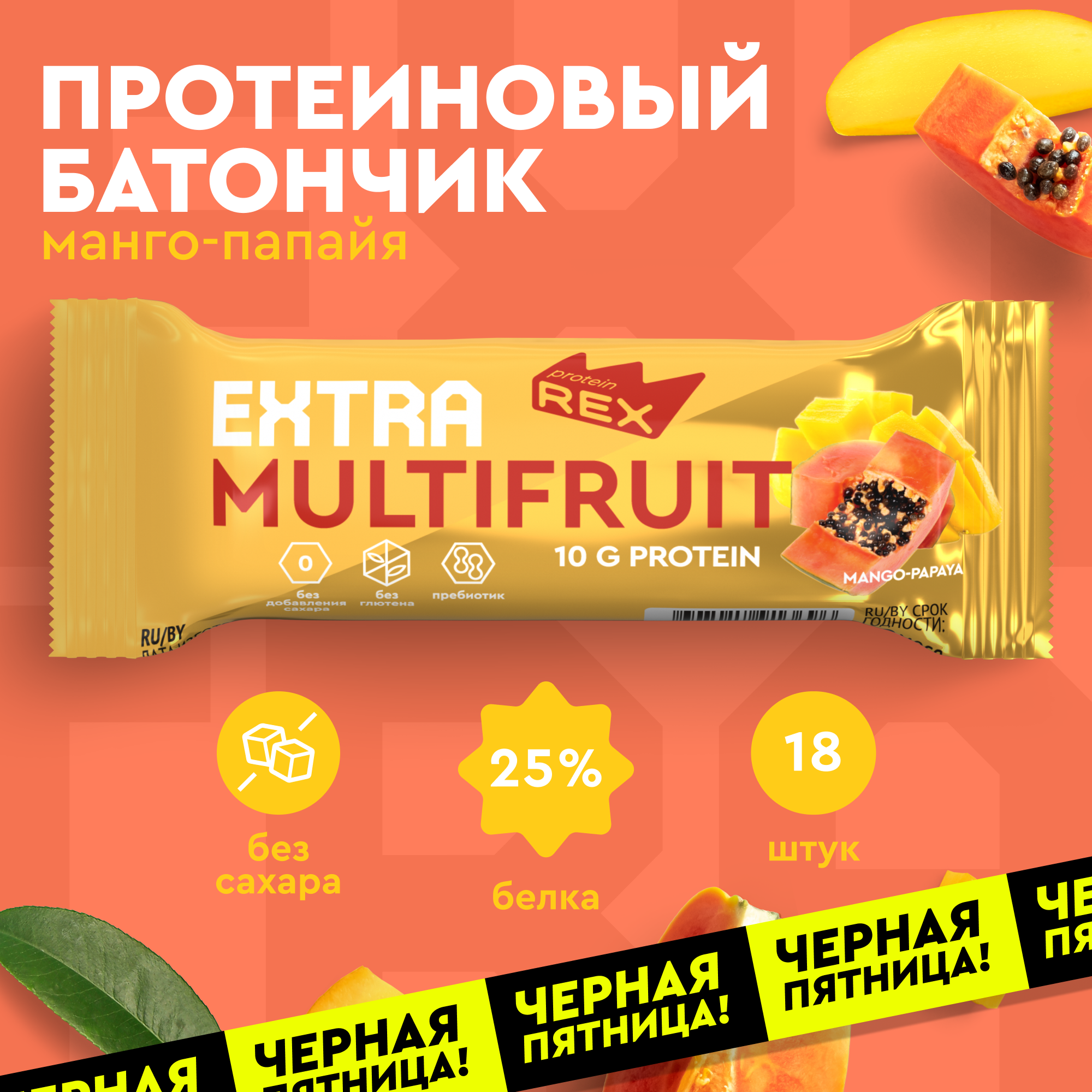 Протеиновые батончики без сахара ProteinRex EXTRA (Экстра) мультифруктовый (манго-папайя) ПП еда, спортивные батончики 18 шт х 40 г, 120 ккал