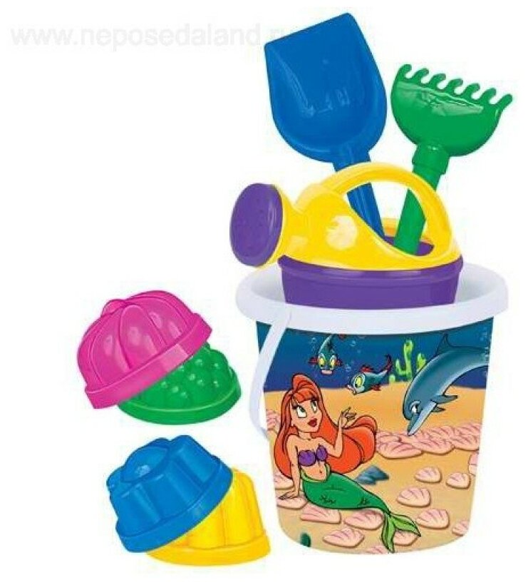 Купить Набор №321: ведро с наклейкой, лопатка №5, грабельки №5, 4 формочки, лейка малая №4