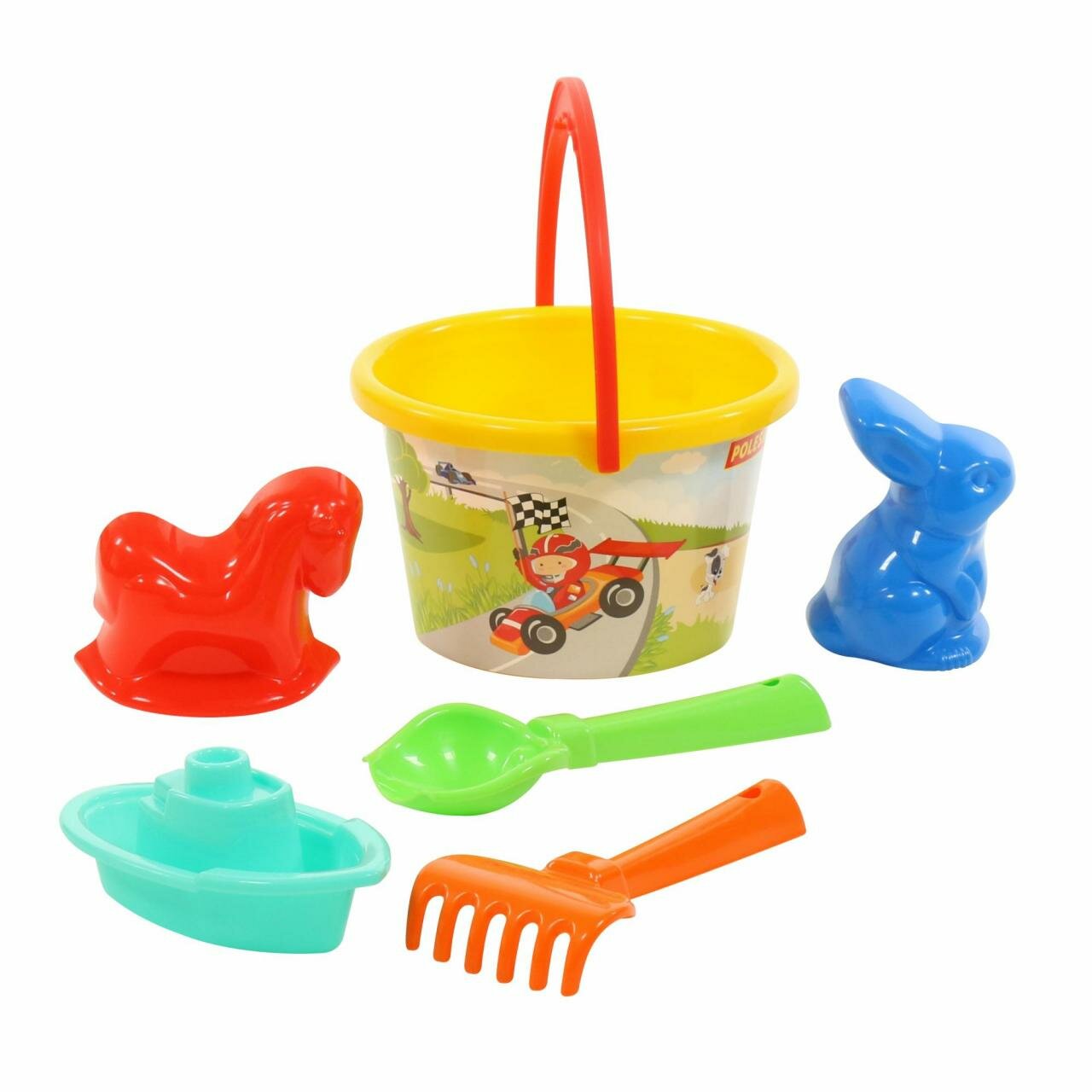 Купить Набор для песочницы №251 (ведро среднее с наклейкой, совок, грабельки, формочки, кораблик) Полесье П-3536