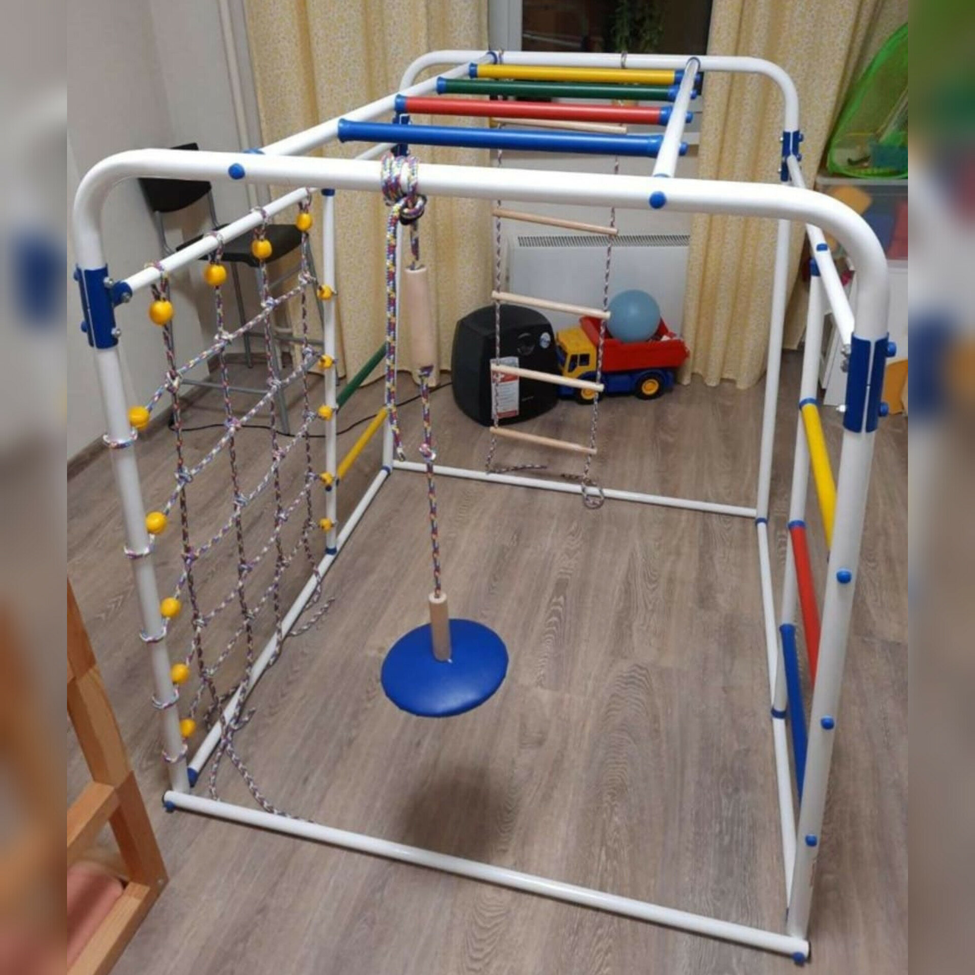 Очень порадовали прорезиненные цветные ступеньки и рукоход! Докупили дополнительно кольца и канат. |