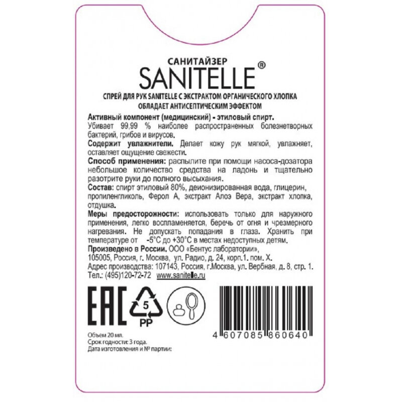 SANITELLE Антисептик для рук SANITELLE хлопок спрей 20 мл 0020-ИП