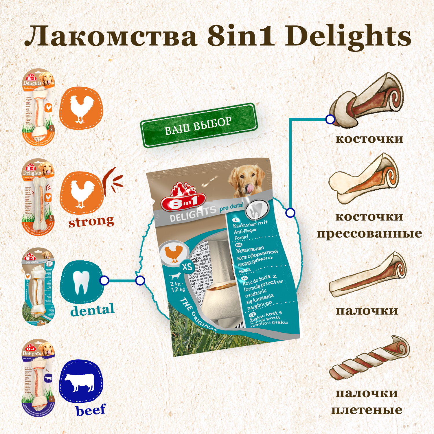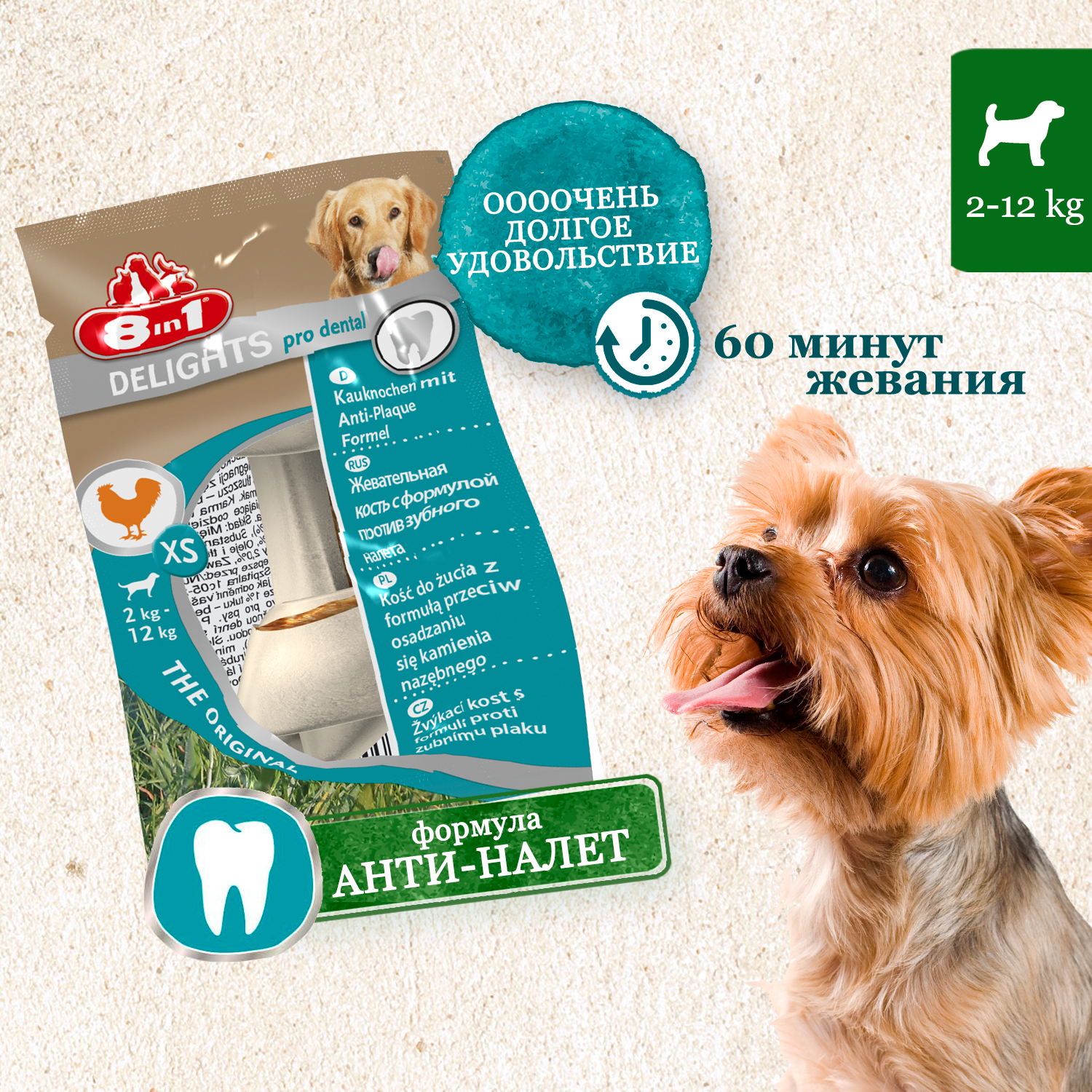 Косточки 8in1 Delights Pro Dental для очистки зубов собак, с куриным мясом в жесткой говяжьей коже, XS (7,5 см), 7 шт.