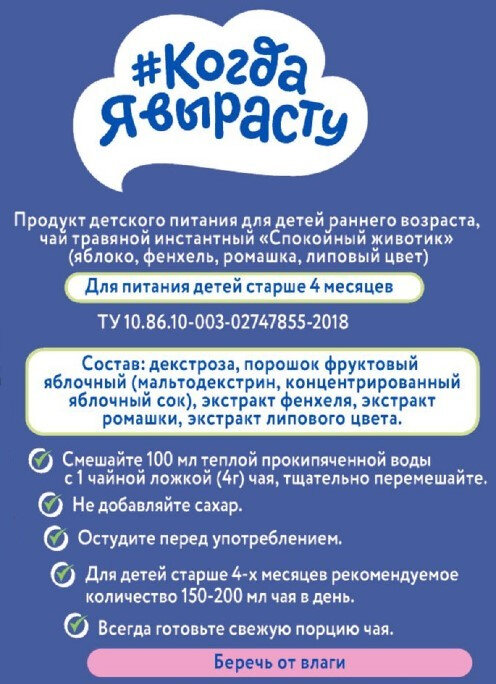 Ниже Вы можете прочитать отзывы на Чай Когда я вырасту 85 г спокойный животик яблоко фенхель ромашка липовый цвет с 4 месяцев, ознакомится с подробными характеристиками, посмотреть интересные обзоры и фотографии на Чай Когда я вырасту 85 г спокойный животик яблоко фенхель ромашка липовый цвет с 4 месяцев.