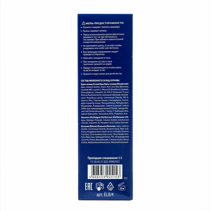 | Дополнительная информация | тест на чувствительности: приготовьте смесь из небольшого количества крем-основы и такого же объёма оксигента, перемешав их в любой неметаллической посуде. Не следует готовить весь объем краски. Нанесите приготовленную смесь на небольшой участок кожи на внутренней стороне локтевого сгиба или за ухом и оставьте на 10-15 минут. Затем смойте. Если в течение суток признаки аллергической реакции не появились, можете использовать краску |