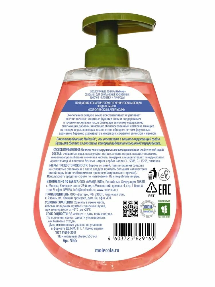 MOLECOLA Экологичное жидкое мыло для рук Королевский апельсин, 550мл