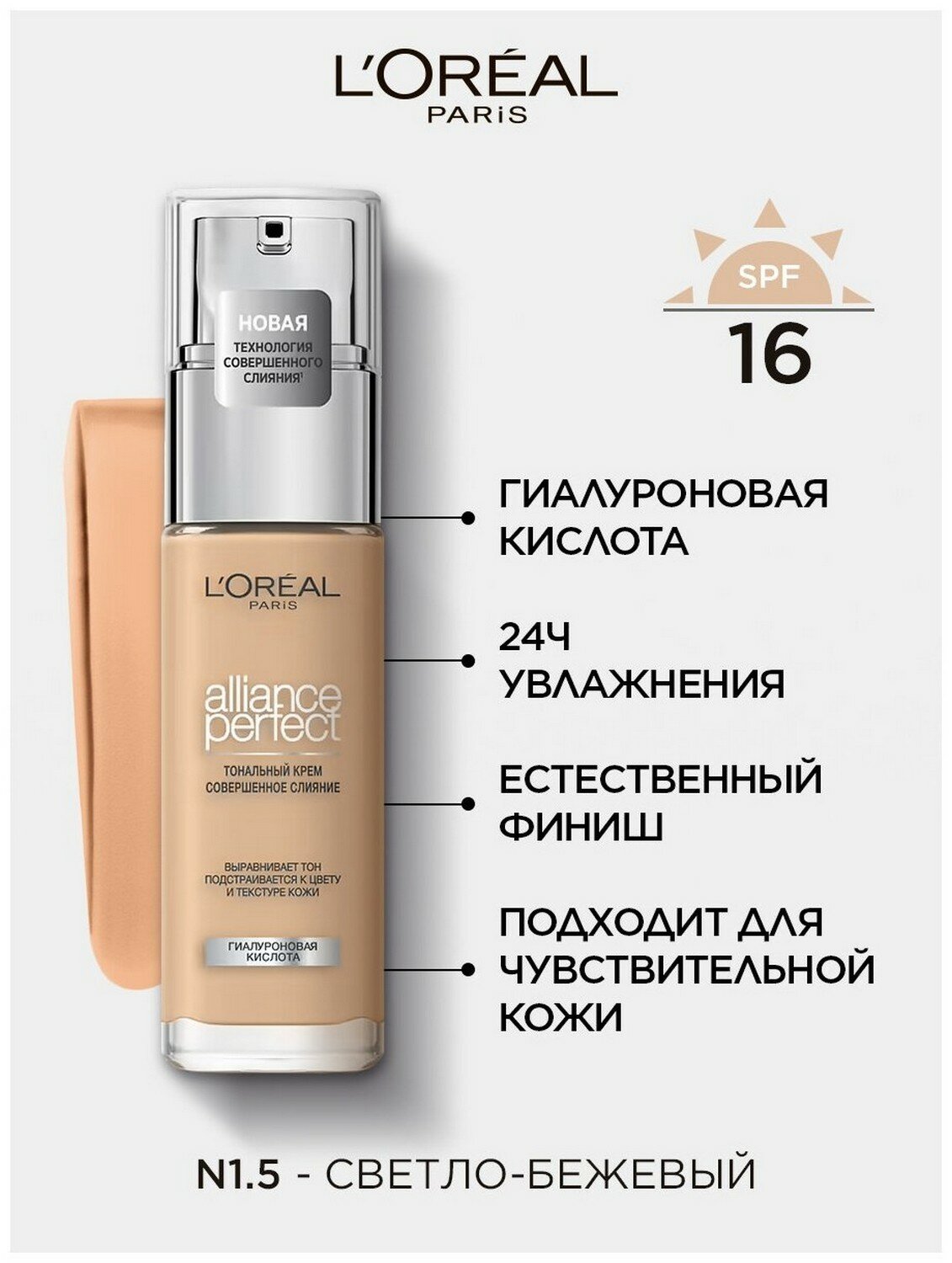 Купить L'Oreal Paris, Тональный крем ALLIANCE PERFECT совершенное слияние обогащенный гиалуроновой кислотой, тон 1.5N, SPF 16, 30 мл