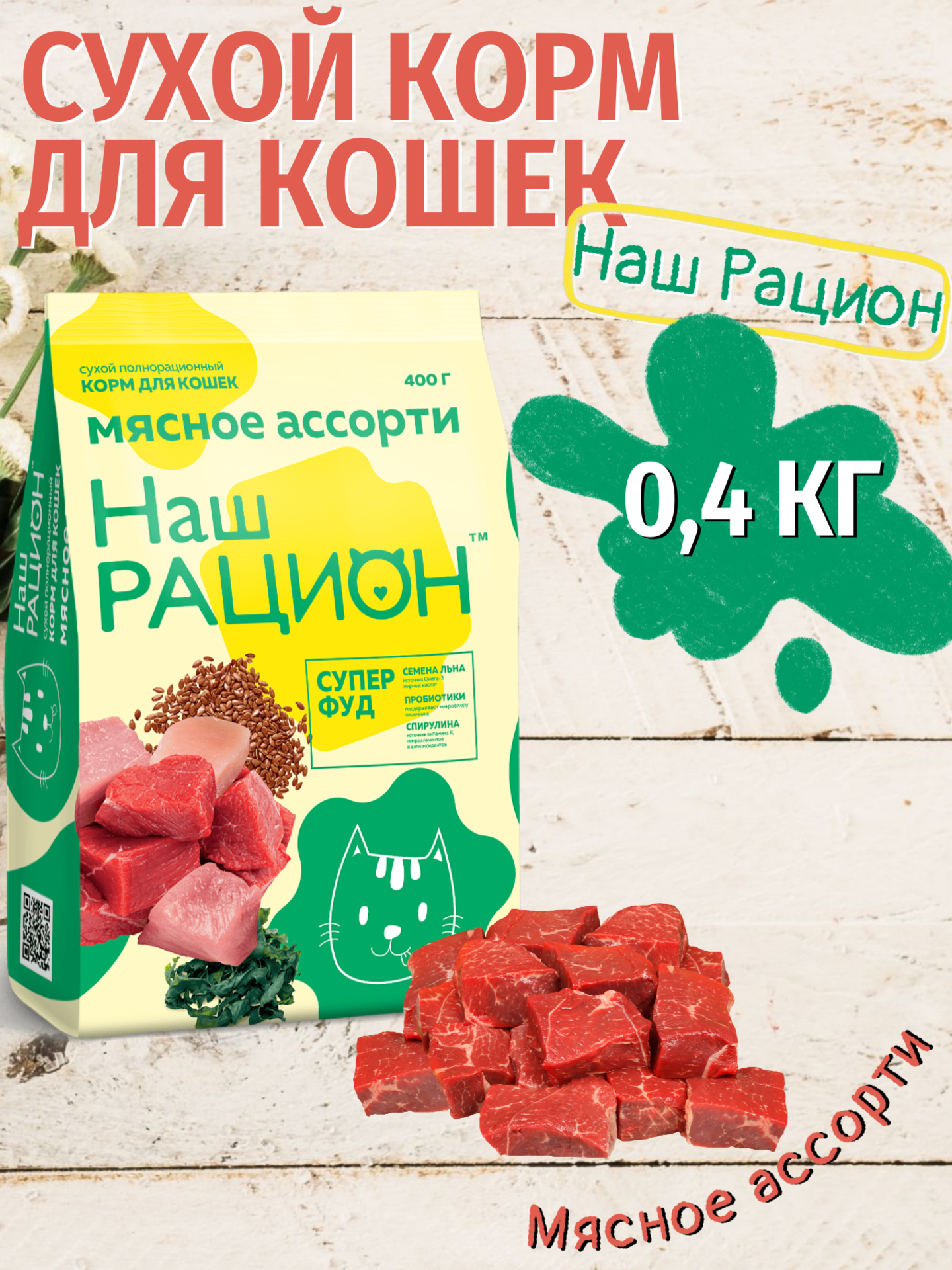 Наш рацион сухой полнорационный корм для взрослых кошекмясное ассорти 400гр