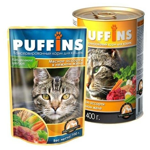 Puffins консерв. 100г для кошек в желе Мясное ассорти кус-ки (дой-пак) 124 (2 шт)